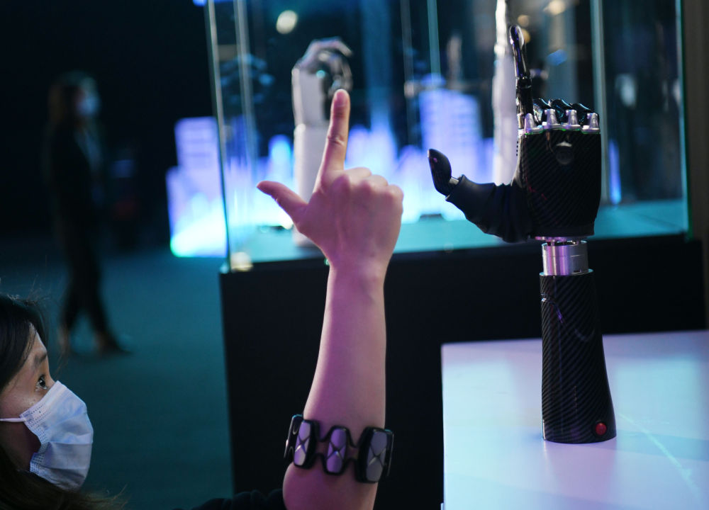 ↑2020年11月25日,工作人员在2020京东全球科技探索者大会上演示一款可穿戴AI仿生手。新华社记者金良快摄
