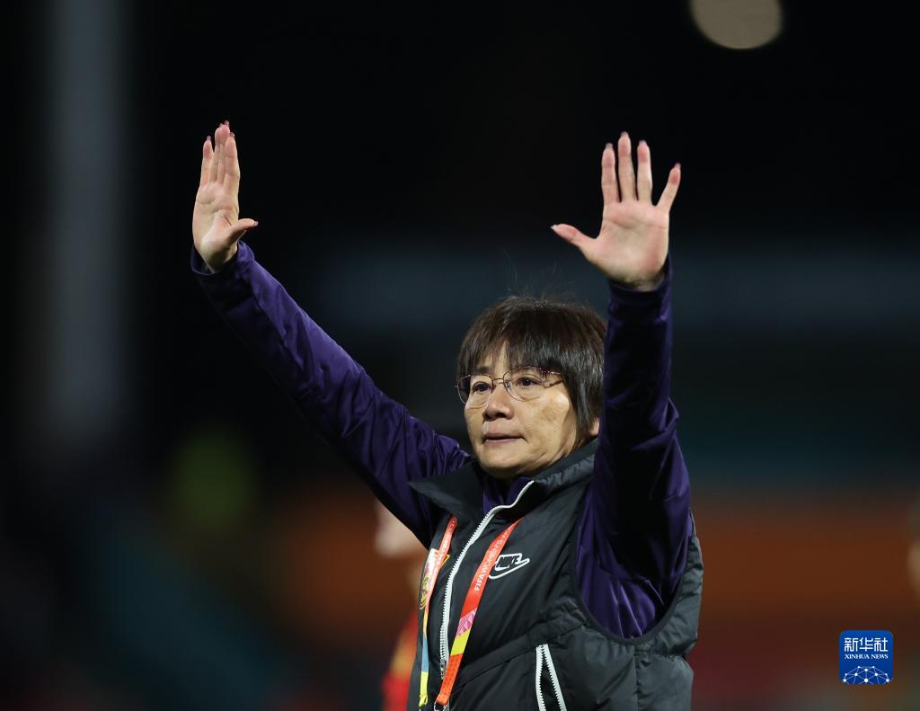 2023年8月1日,中国队主教练水庆霞在澳大利亚阿德莱德举行的2023年国际足联女足世界杯D组对阵英格兰队的比赛后,向球迷举手致意。中国队以1比6不敌英格兰队。新华社记者 张晨 摄