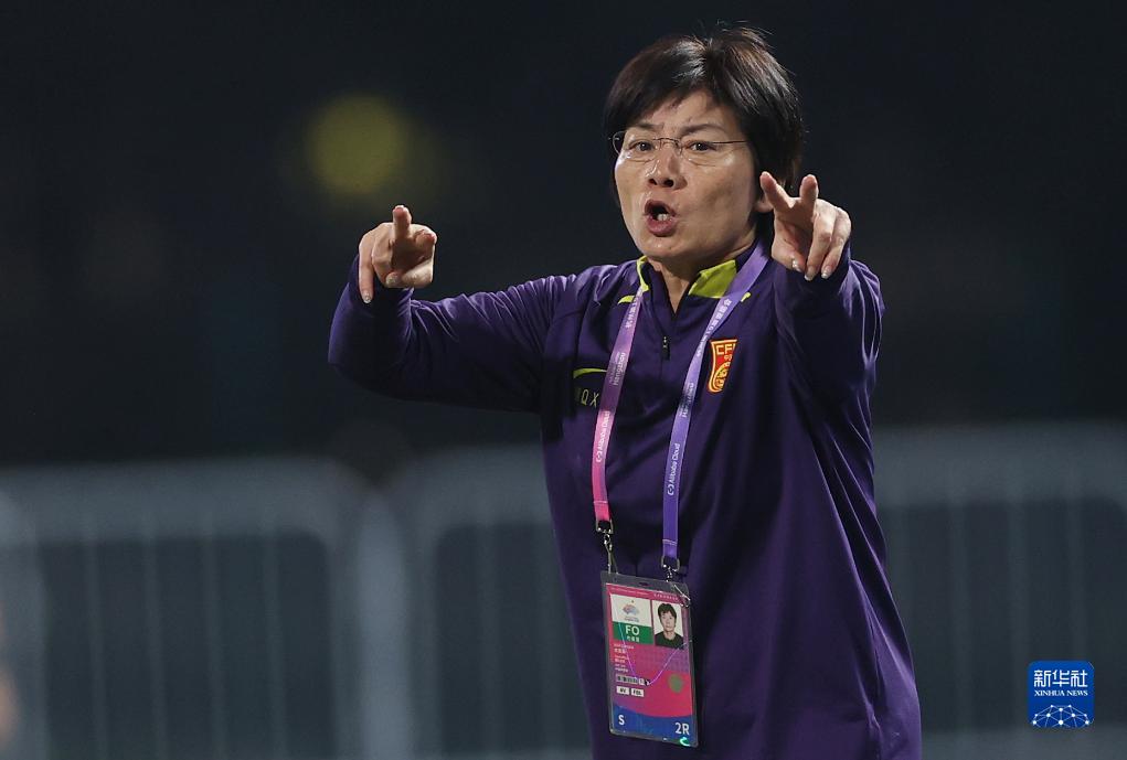 2023年9月30日,在杭州亚运会足球项目女子组四分之一决赛中,中国队主教练水庆霞在场边指挥。中国队以4比0战胜泰国队。新华社记者 贾浩成 摄