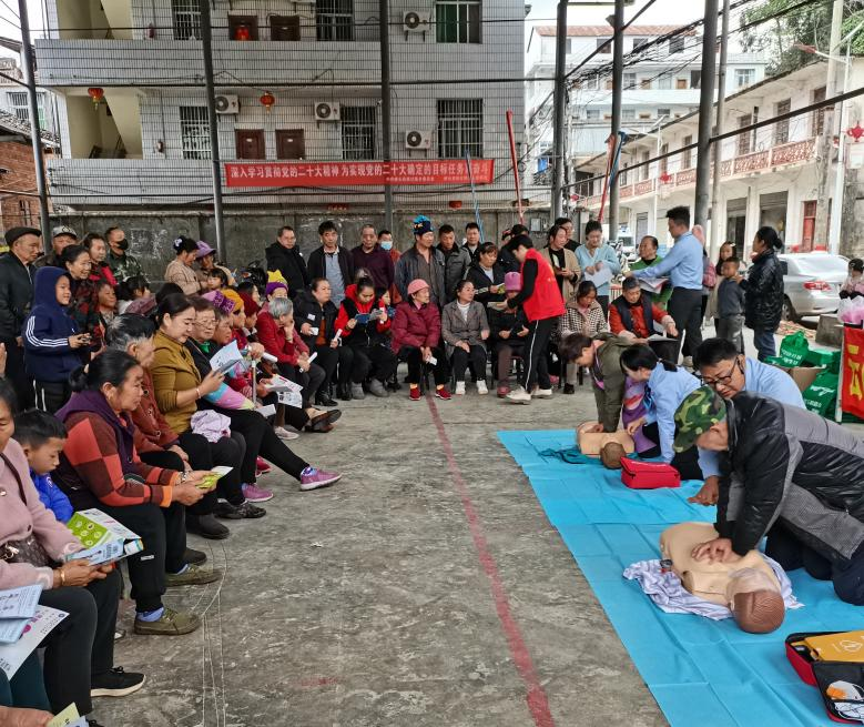 传递急救技能,送“医”服务到身边。1月12日下午,卫生健康志愿服务小分队急诊医学组在桥头街村委会球场对村民开展了一场别开生面的急救技能现场培训。医务人员通过解说、演示、实操教学、有奖问答等方式,分别将成年人及儿童心肺复苏、海姆立克急救法等急救知识传递给现场村民。同时为现场群众进行了义诊服务,吸引了众多患有慢性病和呼吸道疾病的群众,专家团通过询问病史、结合患者实际和需求为村民免费发放了各类家庭药品10余种200余份。