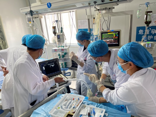 由于赵大叔颈部有颈托固定,又合并气胸,给颈内静脉置管、锁骨下静脉置管都增加了难度,且他的凝血功能差,若误穿动脉则可能导致严重后果。科室值班医师尝试进行股静脉穿刺,但由于赵大叔骨盆骨折,屈曲双腿和不能平卧的体位使穿刺变得异常艰难,多次穿刺都以失败告终。面对如此情况,杨志翔医师果断提出实施超声引导下股静脉穿刺置管术。在床旁超声到位后,杨医师凭借丰富的临床经验及扎实的技能功底,指导永仁县医院重症医学科医护团队在超声引导下顺利完成了股静脉穿刺术,为赵大叔开通了“救命通道”,给救治赢得了宝贵时间。