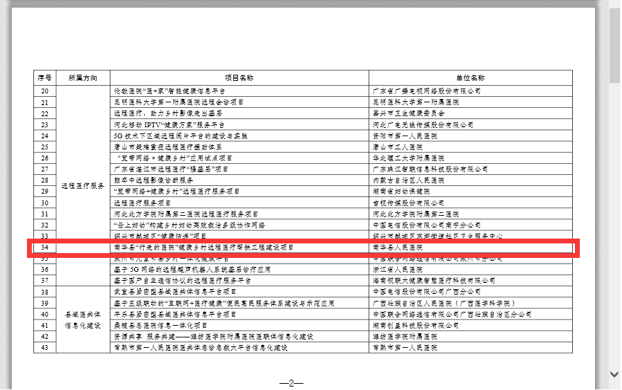 云南网讯(通讯员 代必荣)近日,工业和信息化部办公厅、国家卫生健康委员会办公厅关于公布“宽带网络+健康乡村”入围应用试点项目(第一批)通知,南华县“行走的医院”健康村远程医疗帮扶工程建设项目成功入围成为全国117个试点项目之一。