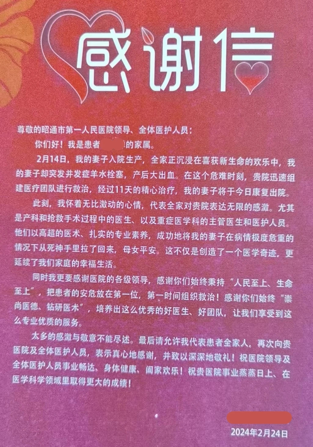 一重难就是一重关,难过也要关关过。随着逐步脱险,产妇身体也逐渐好转,5日后转入产科普通病房直至出院。产妇丈夫特地来医院向医护人员表达了衷心感谢。