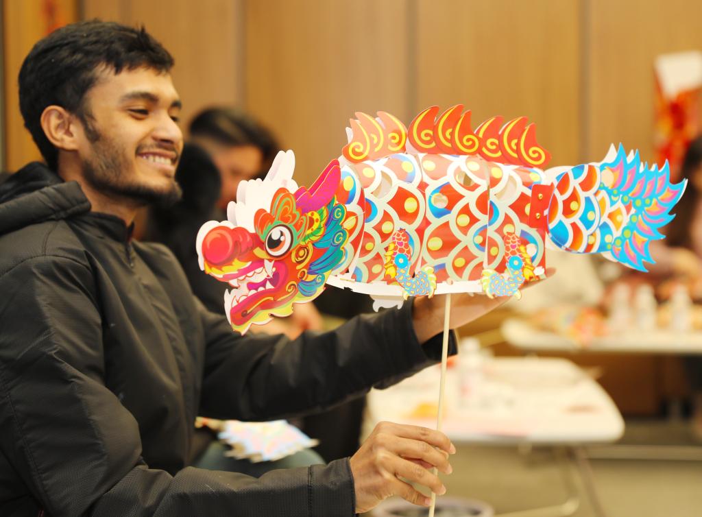 2月23日,在山东自贸试验区青岛片区,外国留学生拼装龙形花灯。新华社发(张进刚摄)