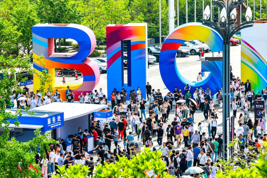 2023年5月26日,参会者从中国国际大数据产业博览会展馆外的大数据标识前经过。新华社记者欧东衢摄