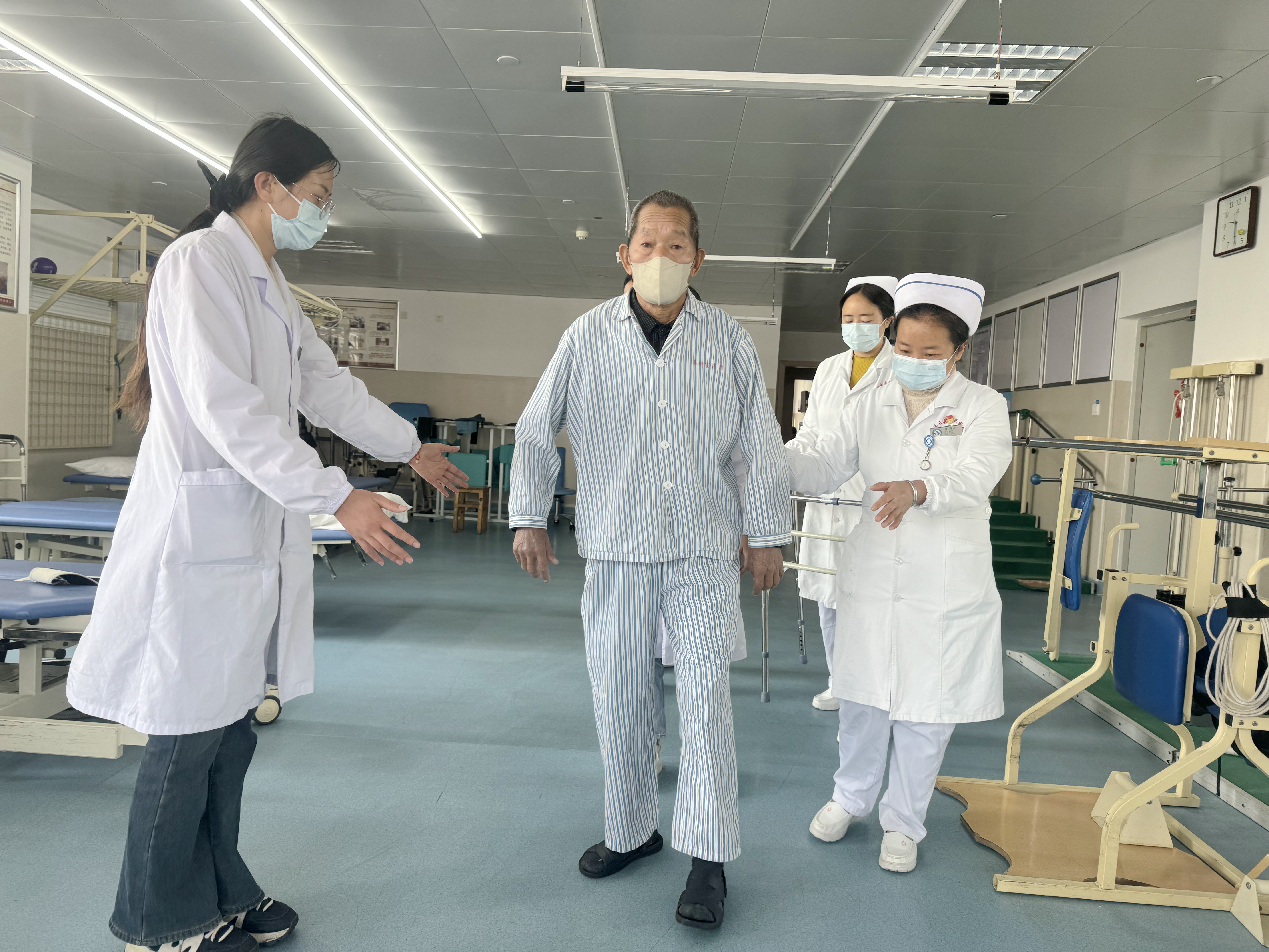 30天后,张大爷能在床上自行活动四肢,接着开始了坐位平衡训练,以防止体位性低血压发生,为今后站立和行走打下基础,张大爷努力地配合治疗,按医生的要求艰难地完成每一个康复动作。137天后,张大爷终于站起来,在运动治疗室扶着平衡杠走,借助助行器一步一步走。2024年3月14日,张大爷终于放开了助行器,在运动治疗室里迈出轻快的步伐,在病床上躺了10个月的张大爷哽咽地说:“没想到我还能走,太感谢医生了。”