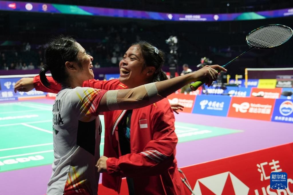 5月3日,印度尼西亚队组合拉哈尤/西蒂(上)在女子双打比赛后庆祝胜利。她们2比0战胜泰国队组合琼卡潘/拉温达。新华社记者 贾浩成 摄