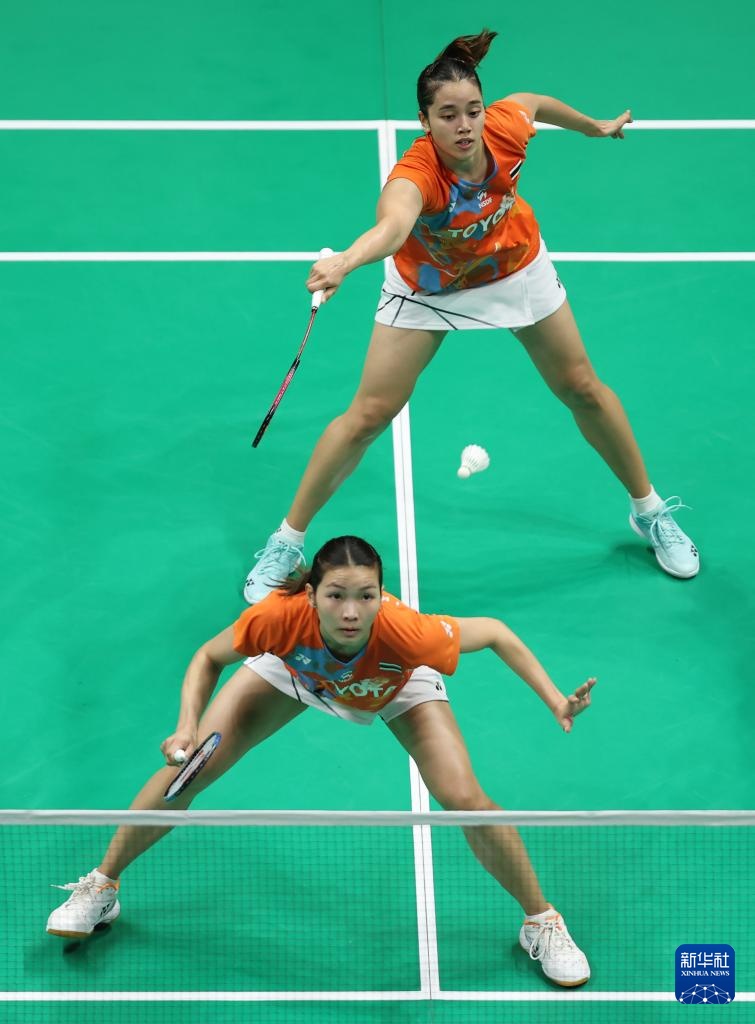 5月3日,泰国队组合琼卡潘/拉温达(上)在女子双打比赛中。她们0比2不敌印度尼西亚队组合拉哈尤/西蒂。新华社记者 贾浩成 摄