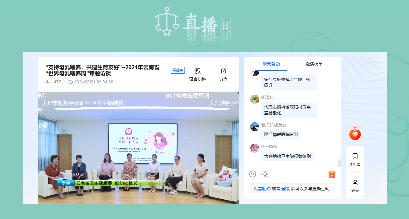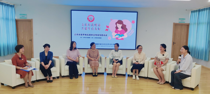 8月7日上午,云南省卫生健康委在云南省妇幼保健院儿童早期发展中心举办“支持母乳喂养,共建生育友好--2024年云南省‘世界母乳喂养周’专题访谈”省级主题宣传活动,活动邀请了政策制定者、医生、护理人员、母乳咨询师、拥有三个宝宝养育经验的妈妈代表,以专题访谈直播的方式共同针对母乳喂养、促进儿童健康发展的话题进行讨论。省卫生健康委妇幼处李楠处长作为主持人主持了专题访谈。