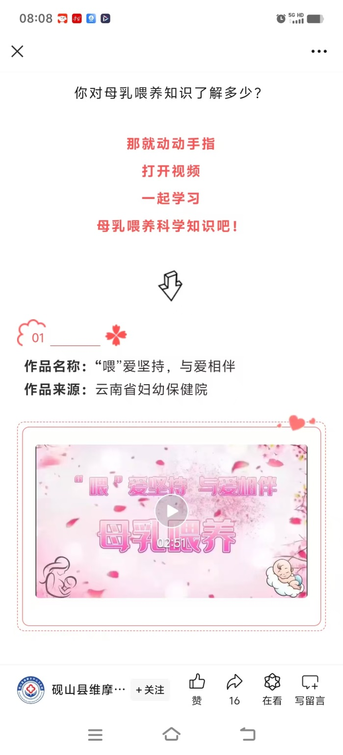 同时利用国家卫生健康委员会发布的宣传海报,国家妇幼中心举办的“母乳喂养优秀短视频展播”活动,主动向孕前、孕中、产后等夫妇和家庭普及母乳喂养健康教育核心信息,发放知识要点宣传手册和宣传折页,营造了良好的社会氛围。