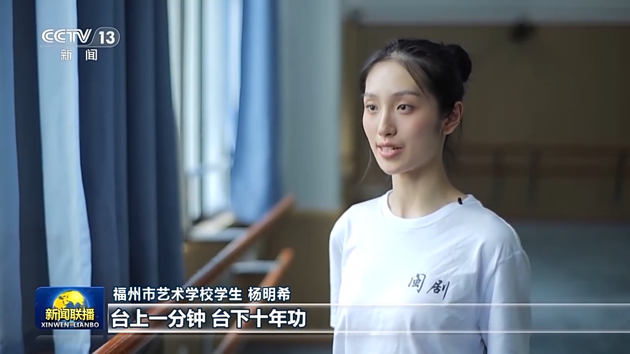 福州市艺术学校学生 杨明希:勤学苦练,振兴闽剧,这八个字时刻提醒我们台上一分钟,台下十年功。我们要学好文化,又要学好专业,学闽剧一定要吃苦才能把基本功打实。