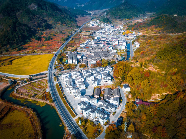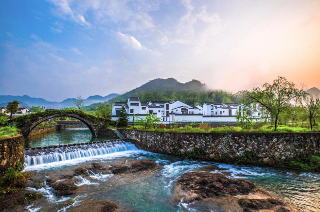 茜溪穿村而过,溪水清澈如镜,不远处,古色古香的村落镶嵌在绿意葱茏的青山之间。