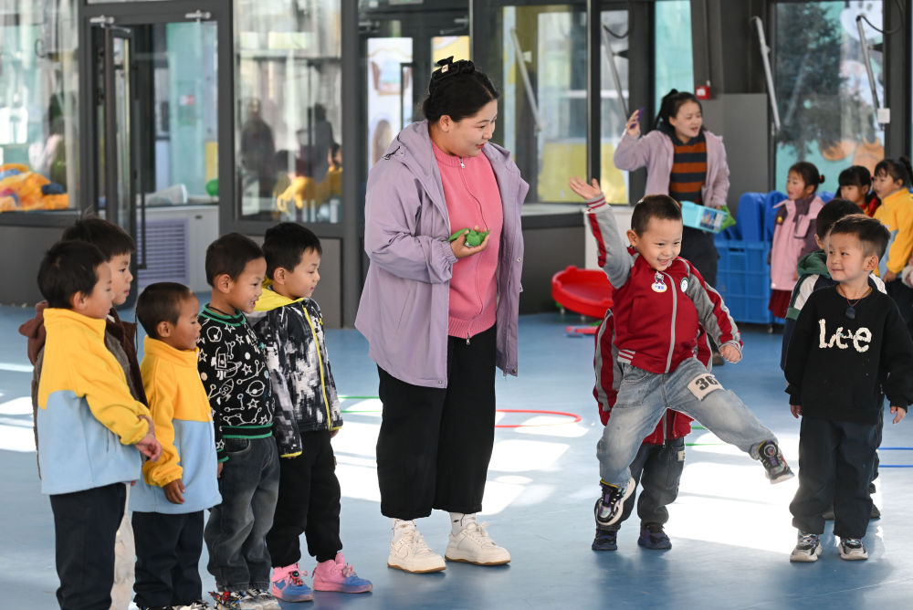 2024年11月14日,在青海省海西蒙古族藏族自治州天峻县民族幼儿园,小朋友们在老师带领下上体育课。新华社记者 张龙 摄
