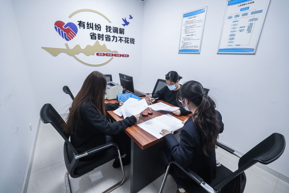 2025年2月25日,在浙江省嘉兴市南湖区社会矛盾纠纷调处化解中心,调解员(右一)在调解金融借款合同纠纷。新华社记者 徐昱 摄