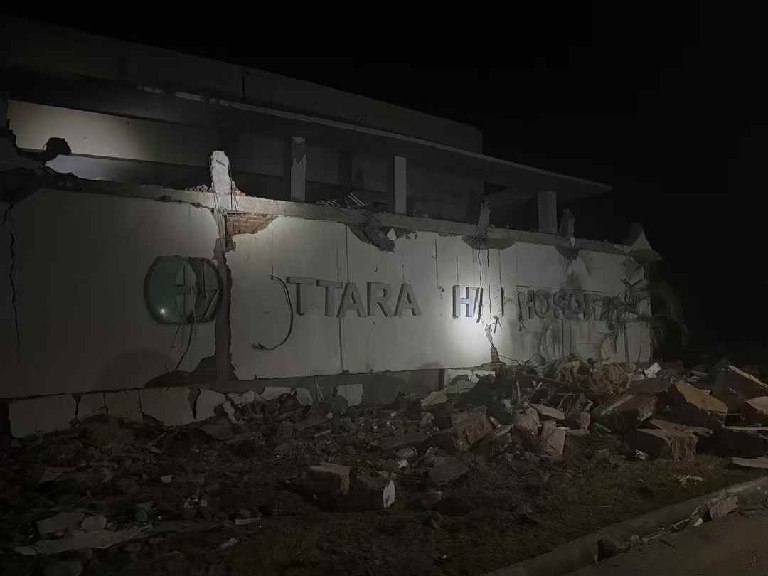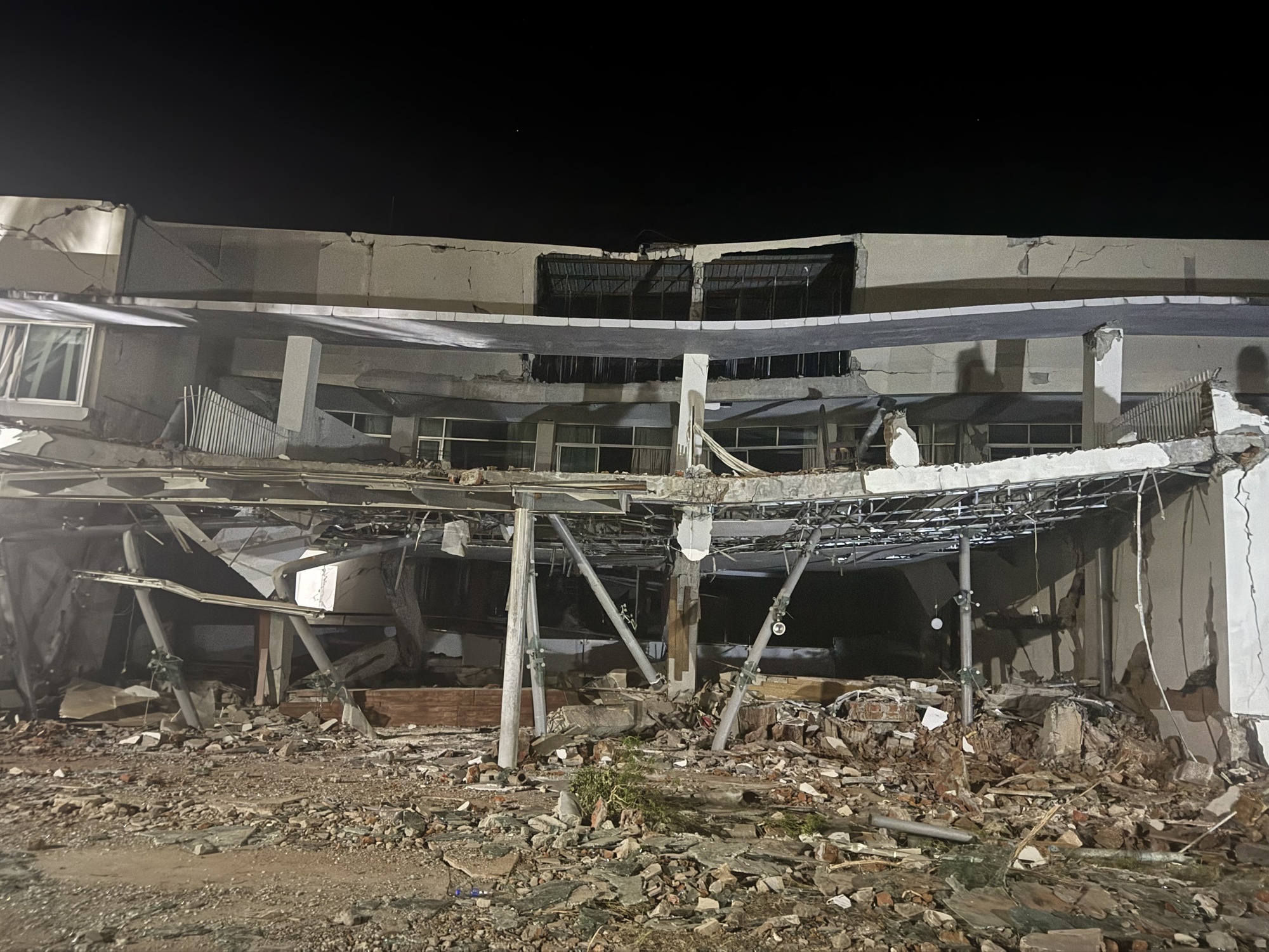 根据当地政府的需求,我们到了内比都的一家医院。医院是三层楼,第一层已经完全垮塌,二层、三层的主体结构稍微完整一些。我们对医院进行了全方位的灾情搜救、侦察和安全风险评估,然后划定了一些区域。