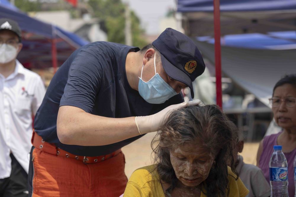 4月3日,在缅甸曼德勒医学院附近的一处安置点,由中国军队参与组派的中国国际救援队队员为居民上药。新华社记者 才扬 摄