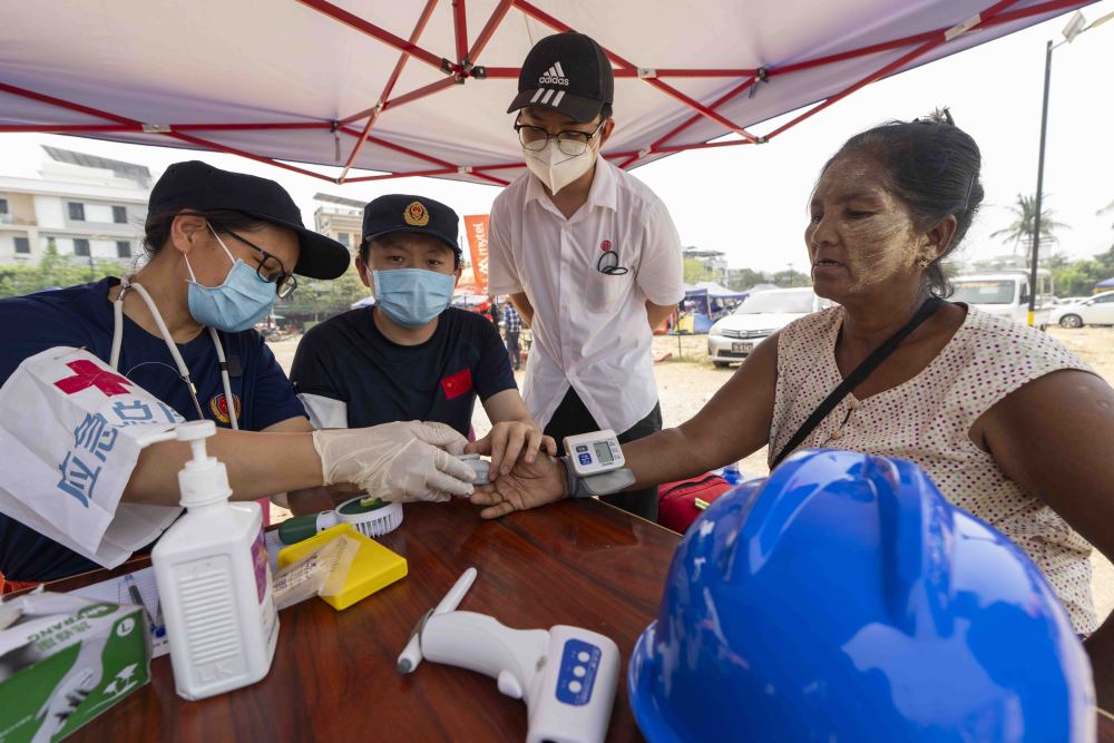 4月3日,在缅甸曼德勒医学院附近的一处安置点,中国救援队队员为居民量血压血氧。新华社记者 才扬 摄