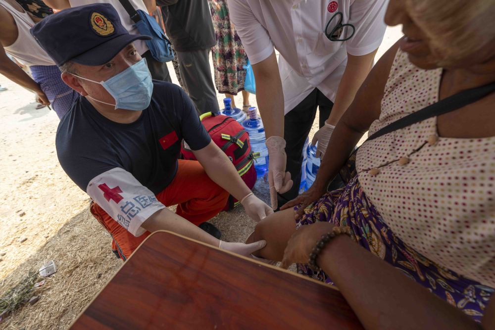 4月3日,在缅甸曼德勒医学院附近的一处安置点,中国救援队队员为一女子检查关节损伤情况。新华社记者 才扬 摄