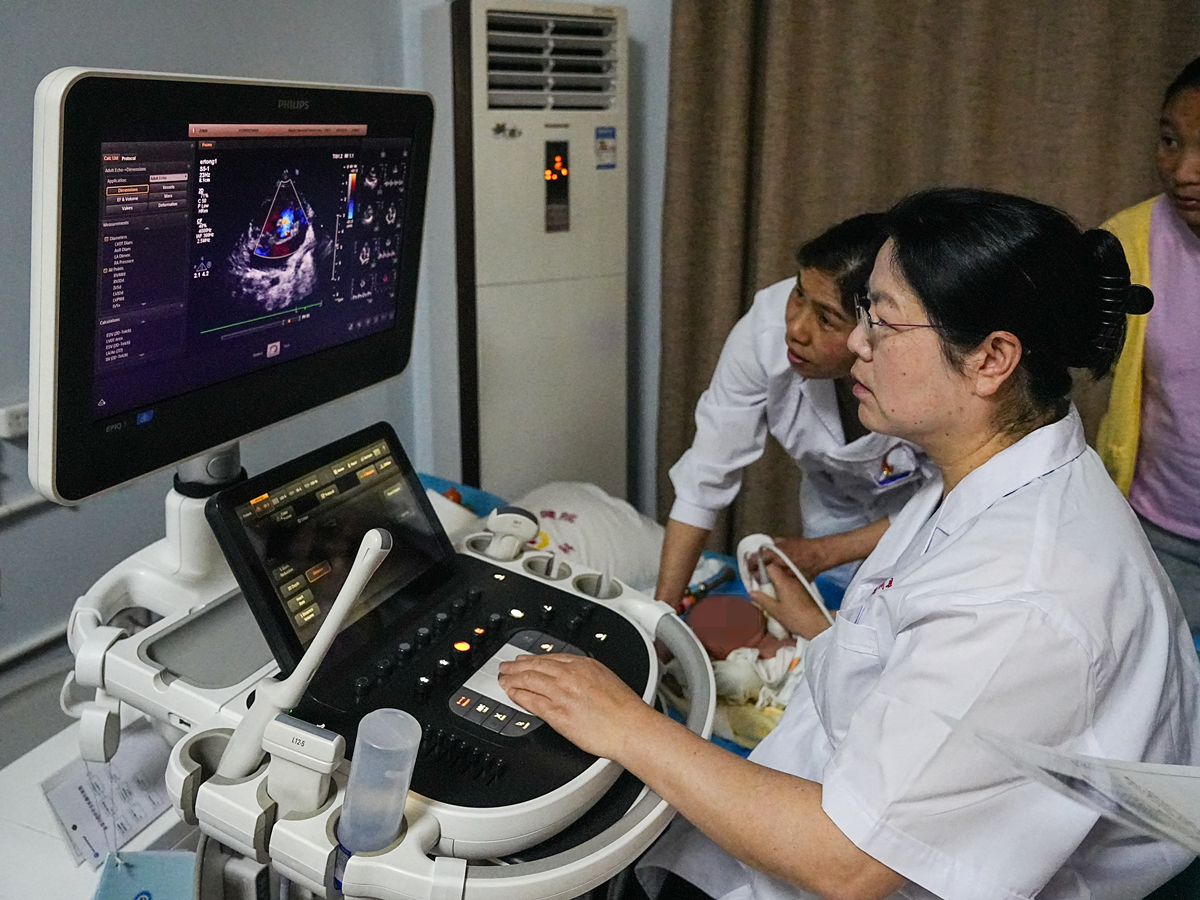 清华大学第一附属医院心脏外科王廉一教授为南涧县儿童做心脏彩超检查。左世玺 供图