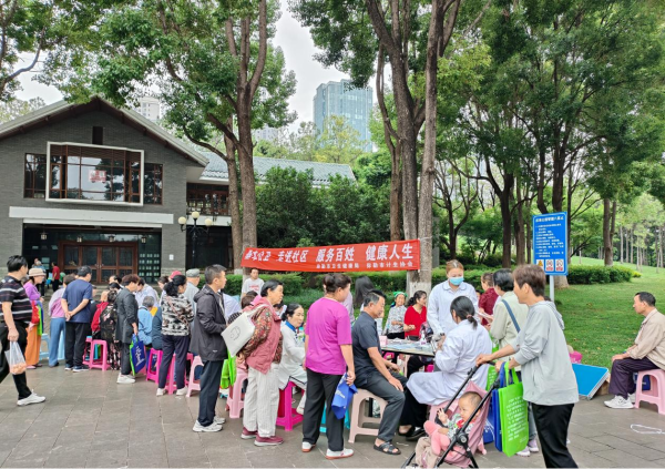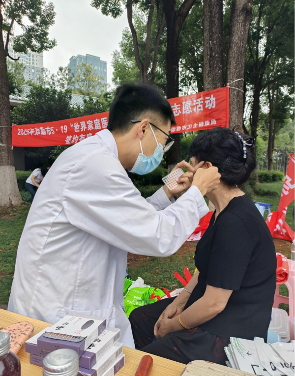 在红河州弥勒市庆来公园,来自市中医医院、弥勒第一医院、市疾控中心等7家医疗卫生机构的20名医护志愿者们,向周边居民发放健康知识宣传资料,宣传国家基本公共卫生服务项目暨家庭医生签约服务新政策、新措施、新内容,中医针灸、温通拨筋、火龙灸、耳穴压豆等疗法深受广大居民欢迎。