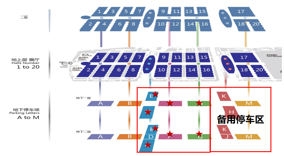 展期小车停车场:展商及观众小车主要停放地下一层二层C/D/E/F/G/区,H/K/M作为备用停车区。