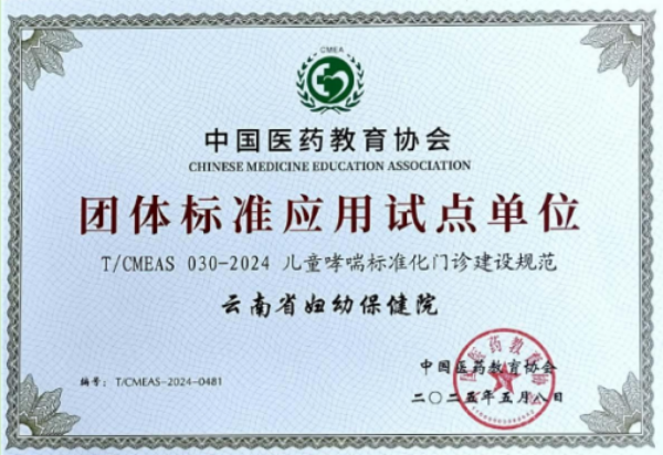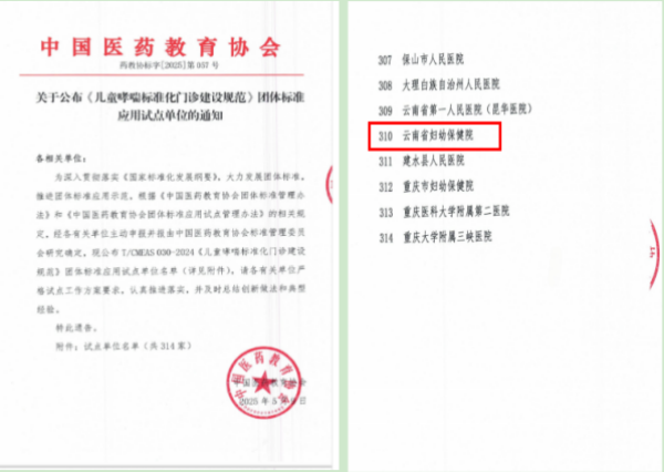 近日,中国医药教育协会发布《关于公布〈儿童哮喘标准化门诊建设规范团体标准〉应用试点单位的通知》,云南省妇幼保健院儿科正式获评为“儿童哮喘标准化门诊”试点单位。这标志着云南省妇幼保健院儿科正式纳入国家级哮喘规范化管理体系,为推进儿童哮喘的科学防治和长期管理奠定了坚实基础。