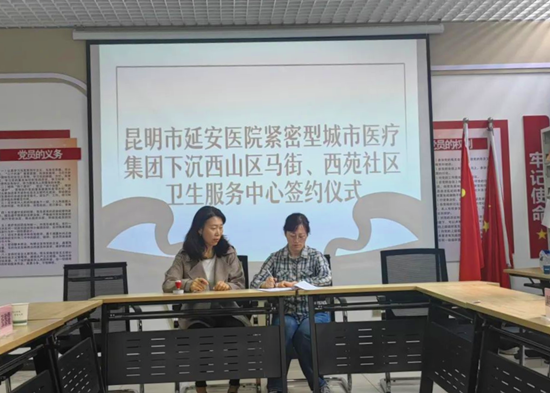 签约仪式上,昆明市延安医院全科医学科主任何燕、老年病科主任医师王瑞萍分别与西山区马街社区卫生服务中心、西苑社区卫生服务中心签订紧密型城市医疗集团服务下沉合作协议。