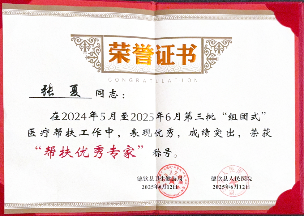 近期,昆明市延安医院医学放射影像科张夏医生因在2024年5月至2025年6月第三批“组团式”医疗帮扶工作中表现优秀,成绩突出,被德钦县卫生健康局授予“帮扶优秀专家”称号。