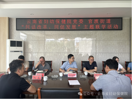 7月18日下午,云南省妇幼保健院党委书记潘旭阳、副院长马俊一行,与官渡街道联合举办“同话改革 同促发展”主题联学活动,官渡街道办主任伍承、街道党工委委员吴睿及街道下辖社区有关人员参加活动,双方围绕云南省妇幼保健院广福路新院区的发展建设进行座谈交流。