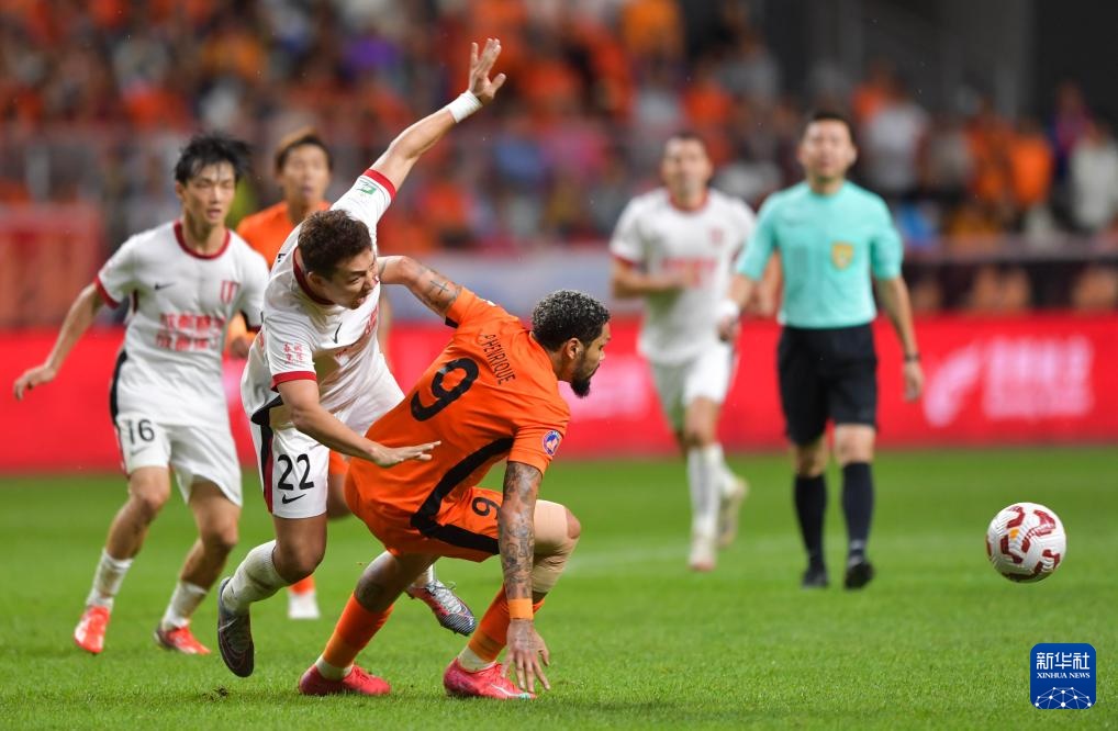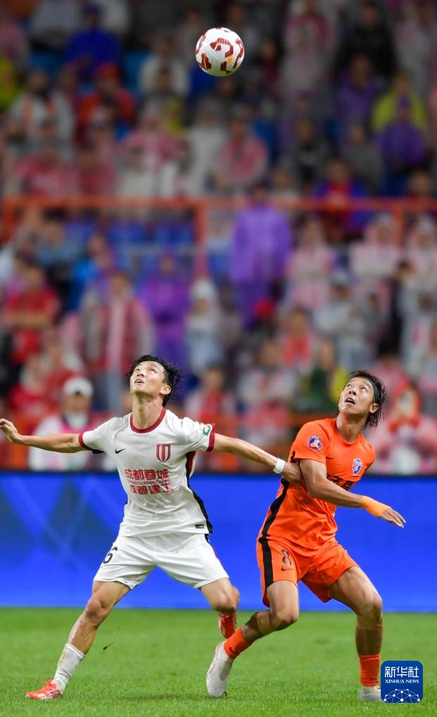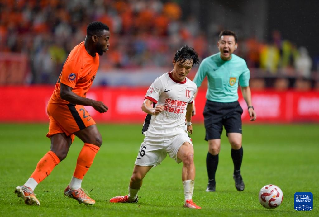 8月23日,成都蓉城队球员费利佩(左)在比赛中铲球。