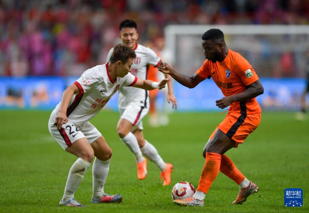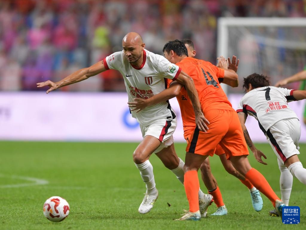 8月23日,云南玉昆队球员奥斯卡(右)与成都蓉城队球员李扬(左)在比赛中拼抢。