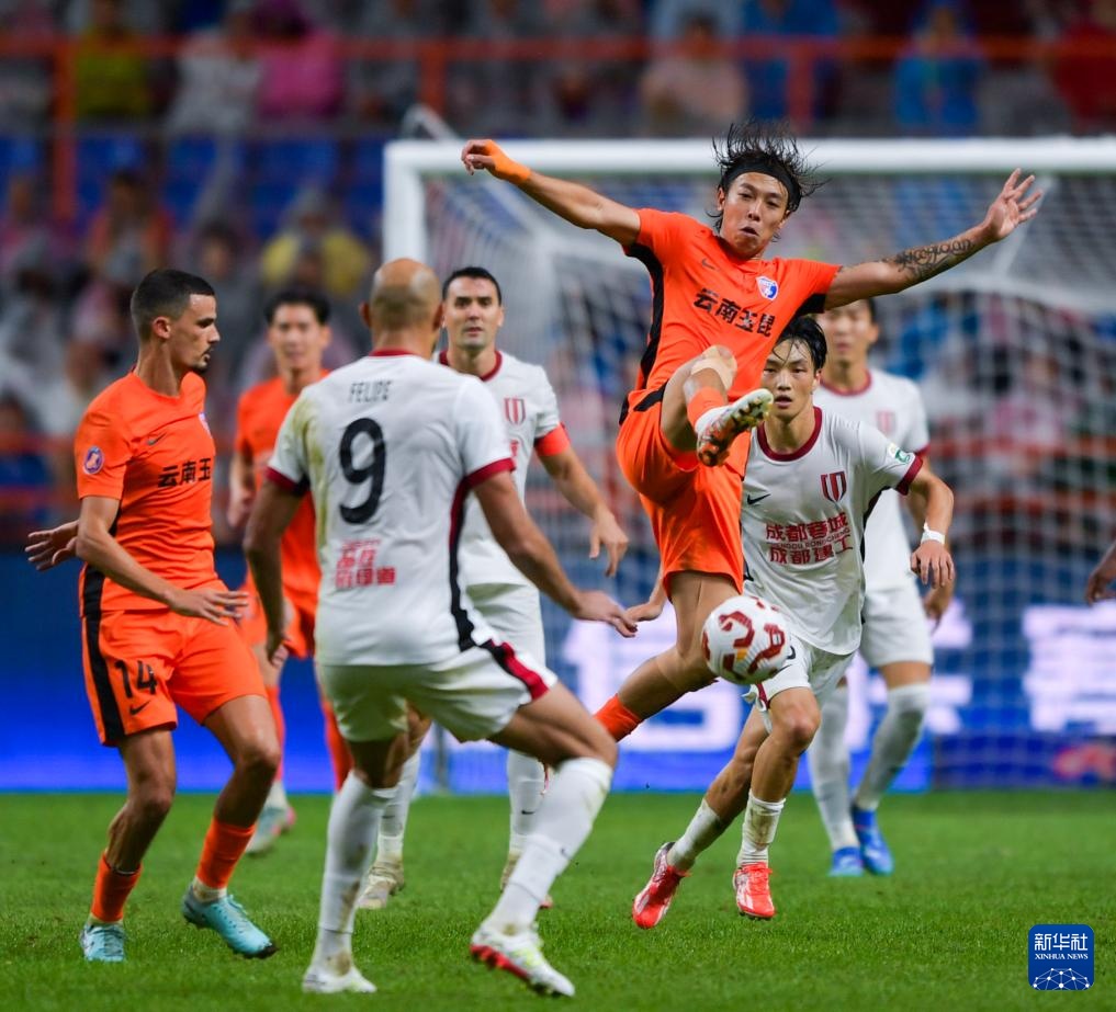 8月23日,成都蓉城队球员费利佩(左)与云南玉昆队球员李松益(右二)在比赛中拼抢。