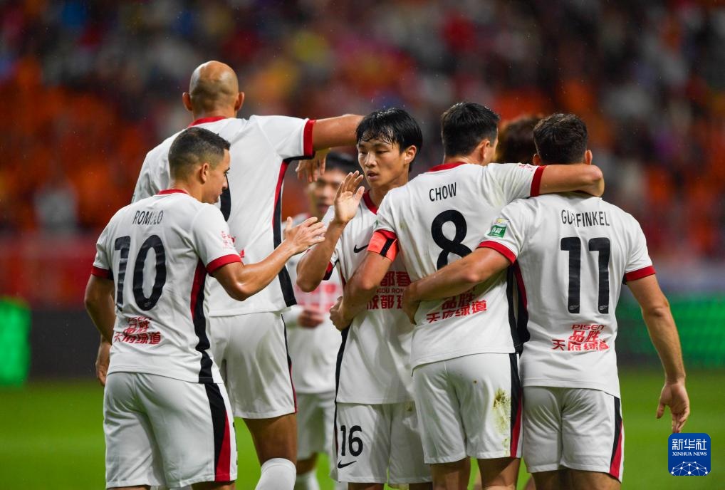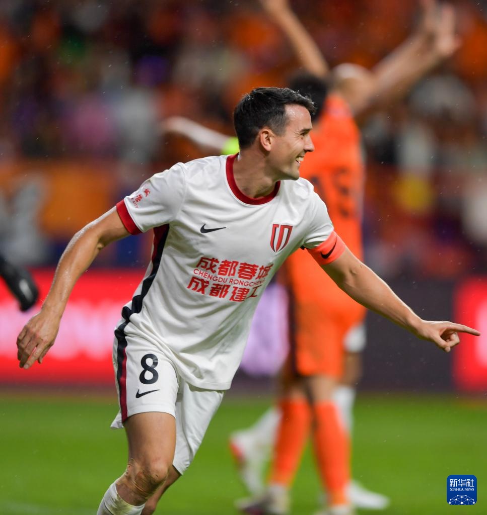 8月23日,成都蓉城队球员在比赛中庆祝进球。