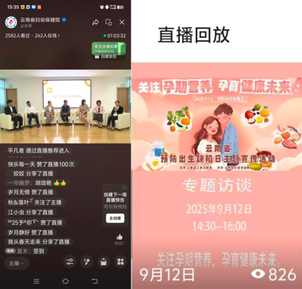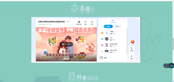 9月12日下午14:30-16:00,省级专题访谈直播同步登陆云南省妇幼保健院微信视频号、云南网妇幼健康专栏及微赞直播三大平台。活动特邀儿童群体保健、围产医学、孕期营养等6个领域权威专家,聚焦云南省出生缺陷防控政策、唐氏综合征预防、全周期体重管理、地中海贫血防控等核心议题,进行多维度解读。据统计,直播及回放累计收看达 5804 人次,实现省、州、市、县、区、乡、村五级医务人员与公众的全面覆盖。