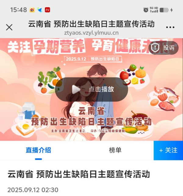 9月12日是全国预防出生缺陷日,云南省围绕“关注孕期营养,孕育健康未来”主题,开展系列主题宣传活动,通过线上线下联动模式,向公众普及出生缺陷防治知识,助力生育友好型社会建设。主要活动于9月12日开展,部分线上活动持续至9月16日。
