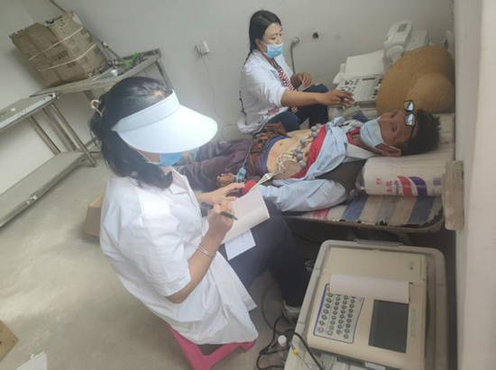 测血压处,护士熟练地为村民绑上袖带,仔细读取数值;视力检测区,村民们依次坐在仪器前,听从医生的指示;B超室里,医生专注地操作着仪器,观察着屏幕上的影像。