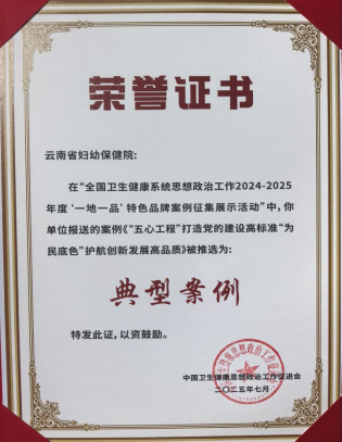 云南省妇幼保健院的这项党建工作经验在全国卫生健康系统思想政治工作2024-2025年度“一地一品”特色品牌案例征集展示活动被推选为“典型案例”。