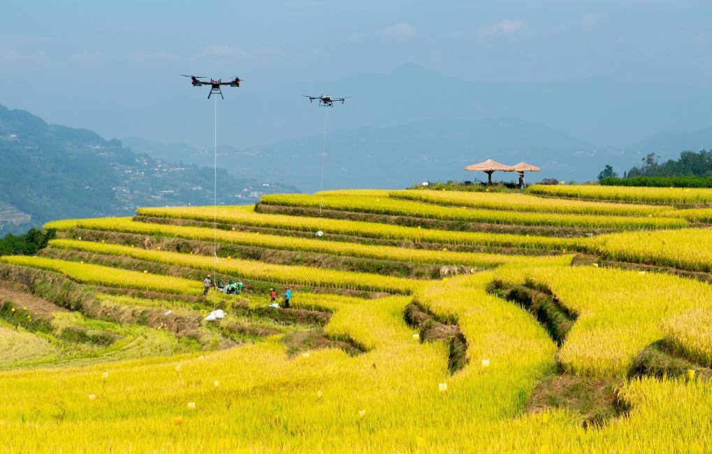 10月10日,湖北省秭归县沙镇溪镇长春村村民用无人机转运收获的水稻(无人机照片)。