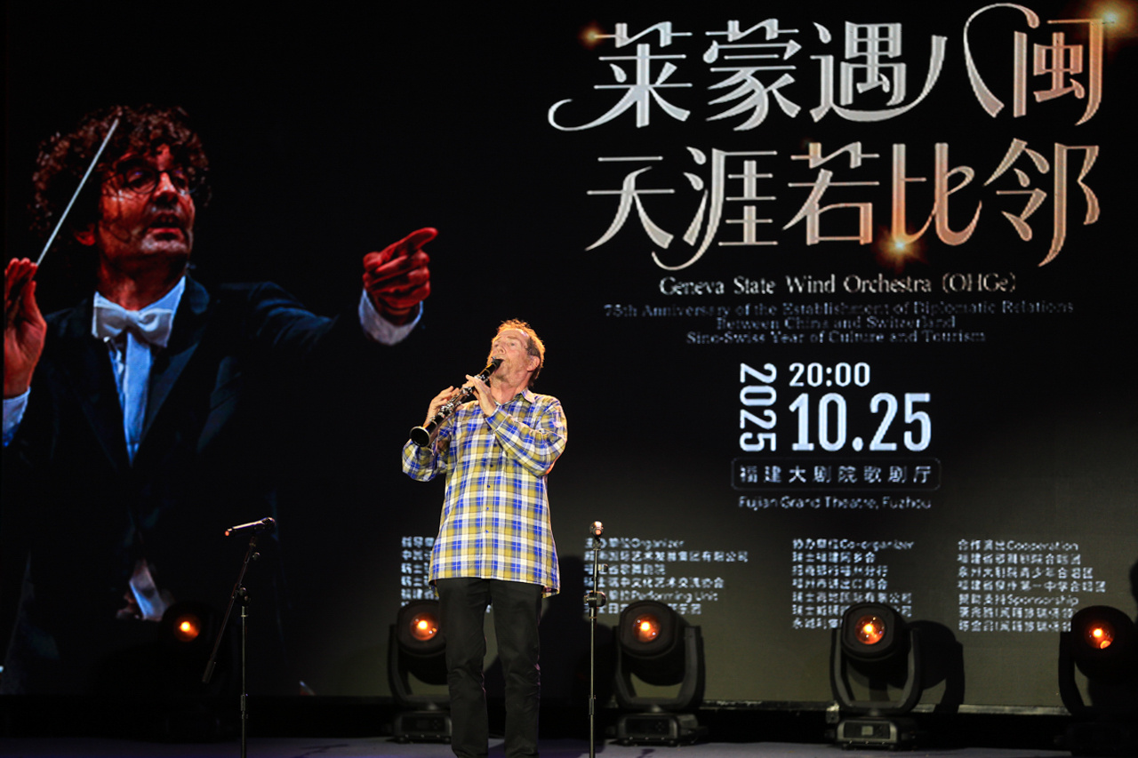 瑞士最古老和建制最全的管乐团——日内瓦州立管乐团的艺术家们走上舞台,热情演奏观众熟悉的《鼓浪屿之波》等中外名曲。