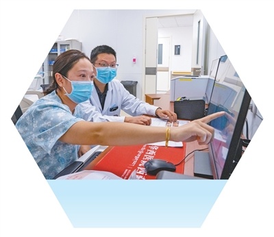 陈霖(后)和同事查看患者检查结果。 本报记者 徐驭尧摄