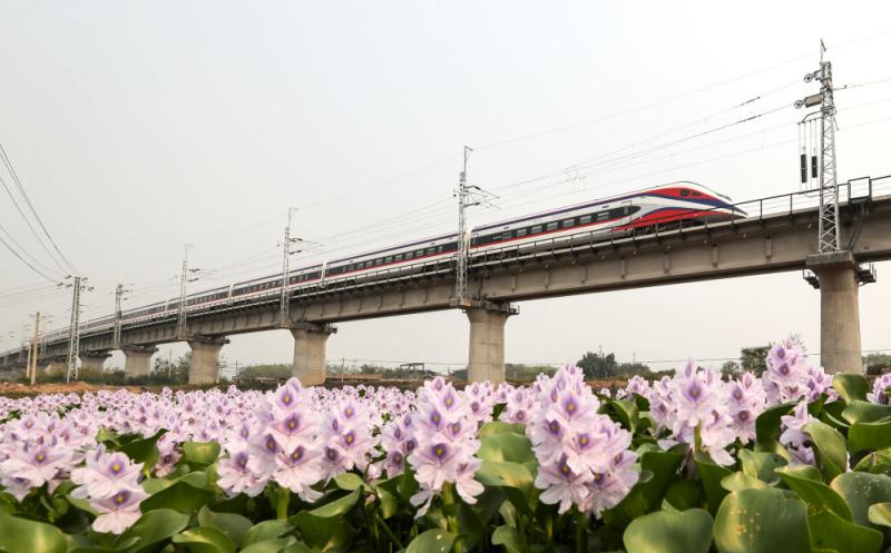 ??2023年4月13日,中老铁路开行国际旅客列车,从老挝万象站驶出的D888次“澜沧号”列车行驶在云南省西双版纳州境内的中老铁路橄榄坝特大桥上。新华社记者单宇琦摄