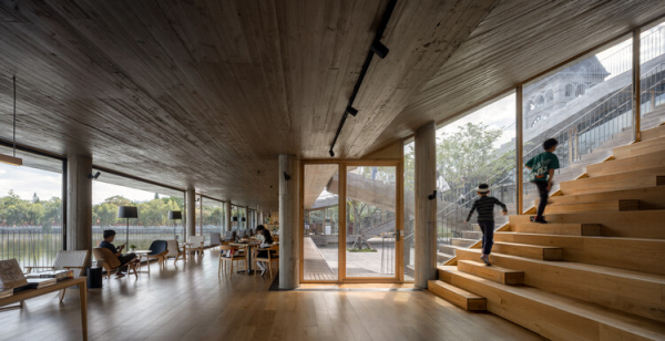 红色的巴劳木屋面从南湖郁郁葱葱的树冠中跳脱出来,与对岸西南联大旧址的红色屋顶遥相呼应。粗粝的木模混凝土和温厚的木材在室内外同时使用,进一步模糊了内与外、城市和建筑的区隔。