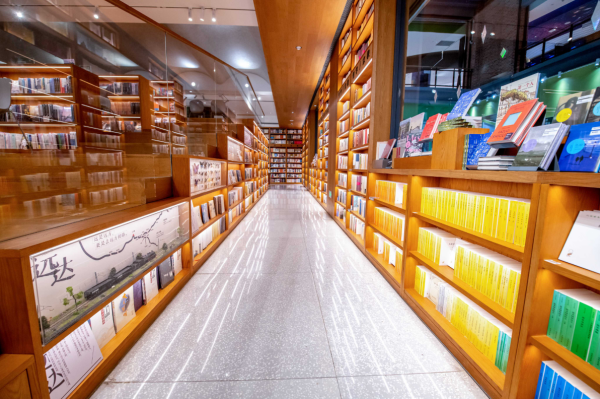 璞玉书店坚持“以书为大”的运营理念,人文社科馆、亲子馆、绘本借阅馆及好奇心小剧场四个场馆的运营,均致力为城市聚集与培育爱阅读、有人文与科学思维底蕴、有志趣与热爱的终身学习者。璞玉书店整体是由AIM恺幕建筑进行设计,主设计师对昆明印象最深的是波光粼粼的滇池,顶面的设计就以非常独特的弧形吊顶出现,诠释“它的波幅顶面,倒映着云南的湖光山色”的意境。店内大面积玻璃幕墙的运用,让一天的日光与书店尽可能地接触,组合出不同的光影律动。空间顶部天空灰的波幅随着一天中的日照变化,在店内不同角度倒映出波光粼粼的光影。让阅读的美,回归到自然中。
