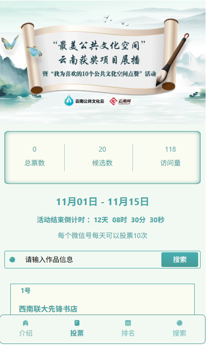 为丰富群众文化生活,云南网联合云南公共文化云对以上斩获全国大奖的“最美公共文化空间”进行展播,让更多网友看到文化空间的场景建设、特色服务、特色设施设备等多方位的“美”,同时也可以为你喜欢的文化空间投上一票。即日起到10月15日之前,可长按下方二维码进投票专属页面点赞,每个微信号每天可以投票10次。欢迎为自己喜欢的10个公共文化空间点赞!