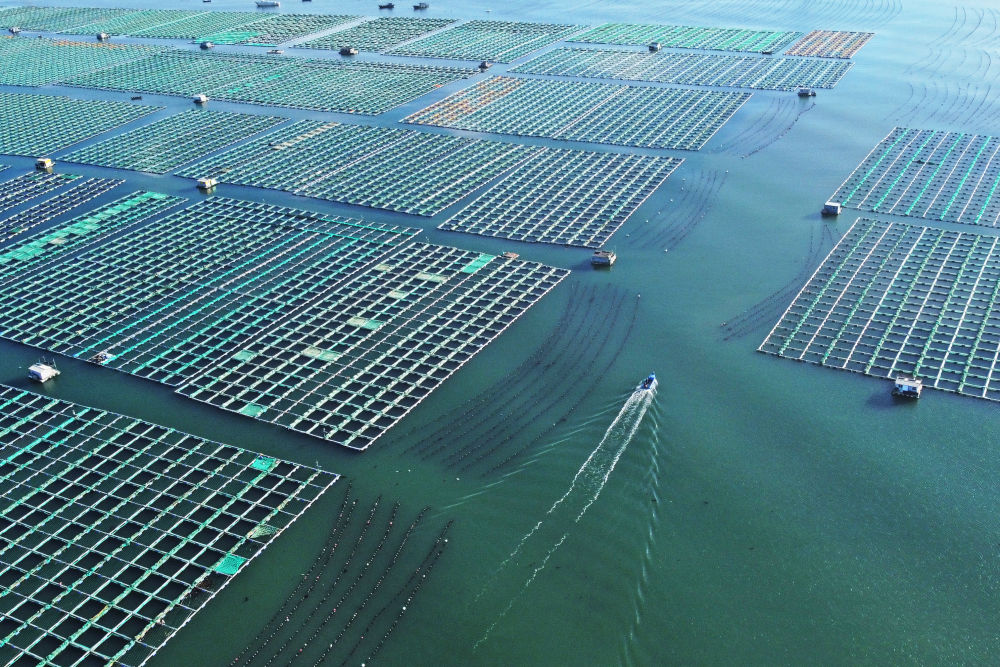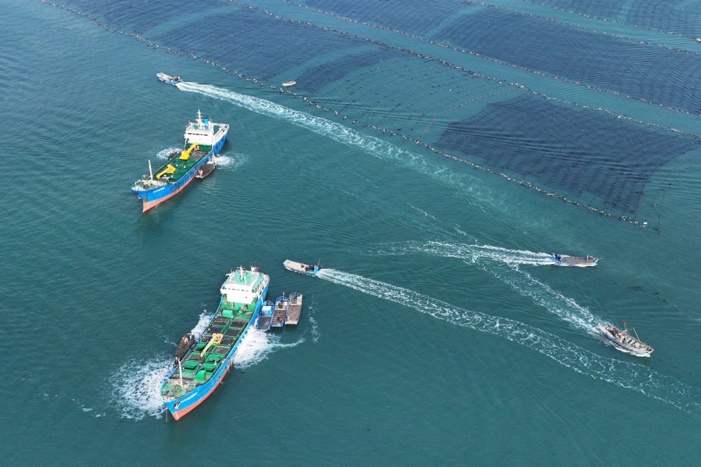 ↑ 11月10日,在山东省荣成市桑沟湾海洋牧场,养殖工人在养殖区穿梭作业(无人机照片)。新华社发(王福东 摄)