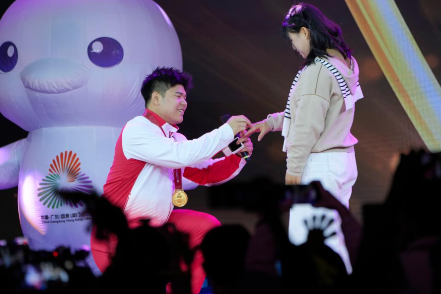 “我想对我的爱人说,这一路走来,辛苦你了,我们经历的那些困难,训练受到挫折的时候,其实很大一部分都是你帮我走出来的,一直陪着我,我举过很重的杠铃,但是都没有我今天要送给你的这枚钻戒沉重,这也是我爱你的决心。露露嫁给我好吗?”