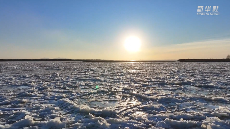 此前奔流不息的松花江绥滨段,如今已化作一片辽阔冰原。从高空俯瞰,厚实的冰层如一条蜿蜒伸展的“冰封大道”,横跨江面;近观岸边,冰层呈鱼鳞状层层叠起,冬日暖阳洒落在冰排与凝固的浪花之上,折射出璀璨光泽,尽显冰的晶莹。