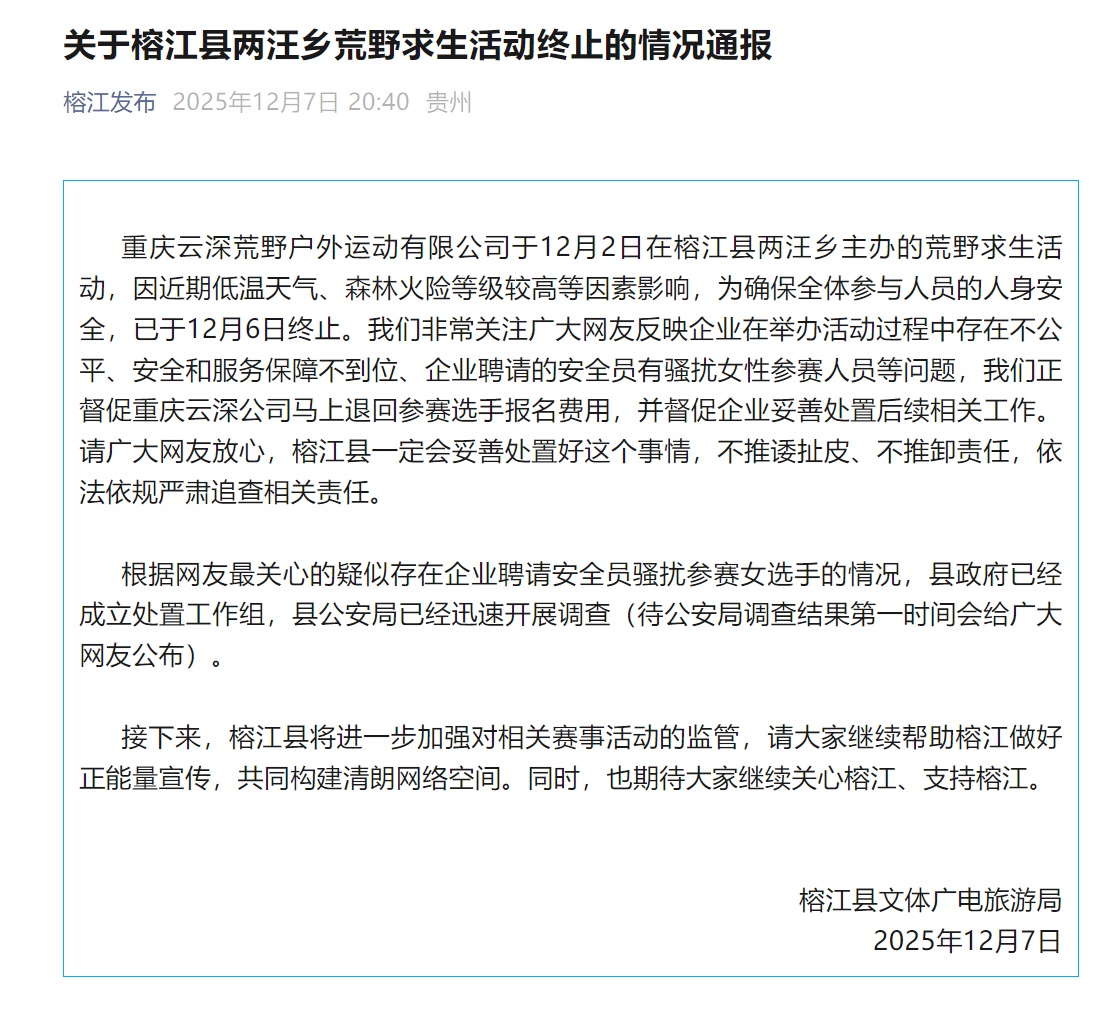 据“榕江发布”微信公众号消息,12月7日,榕江县文体广电旅游局发布情况通报:重庆云深荒野户外运动有限公司于12月2日在榕江县两汪乡主办的荒野求生活动,因近期低温天气、森林火险等级较高等因素影响,为确保全体参与人员的人身安全,已于12月6日终止。我们非常关注广大网友反映企业在举办活动过程中存在不公平、安全和服务保障不到位、企业聘请的安全员有骚扰女性参赛人员等问题,我们正督促重庆云深公司马上退回参赛选手报名费用,并督促企业妥善处置后续相关工作。请广大网友放心,榕江县一定会妥善处置好这个事情,不推诿扯皮、不推卸责任,依法依规严肃追查相关责任。根据网友最关心的疑似存在企业聘请安全员骚扰参赛女选手的情况,县政府已经成立处置工作组,县公安局已经迅速开展调查(待公安局调查结果第一时间会给广大网友公布)。接下来,榕江县将进一步加强对相关赛事活动的监管,请大家继续帮助榕江做好正能量宣传,共同构建清朗网络空间。同时,也期待大家继续关心榕江、支持榕江。