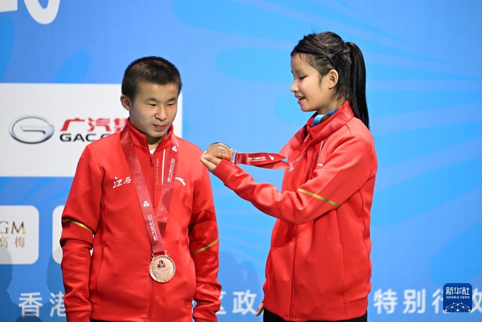 12月13日,江西队组合饶洪南/黄乃林(右)在颁奖仪式上。他们获得混合12-15岁组双打A组季军。