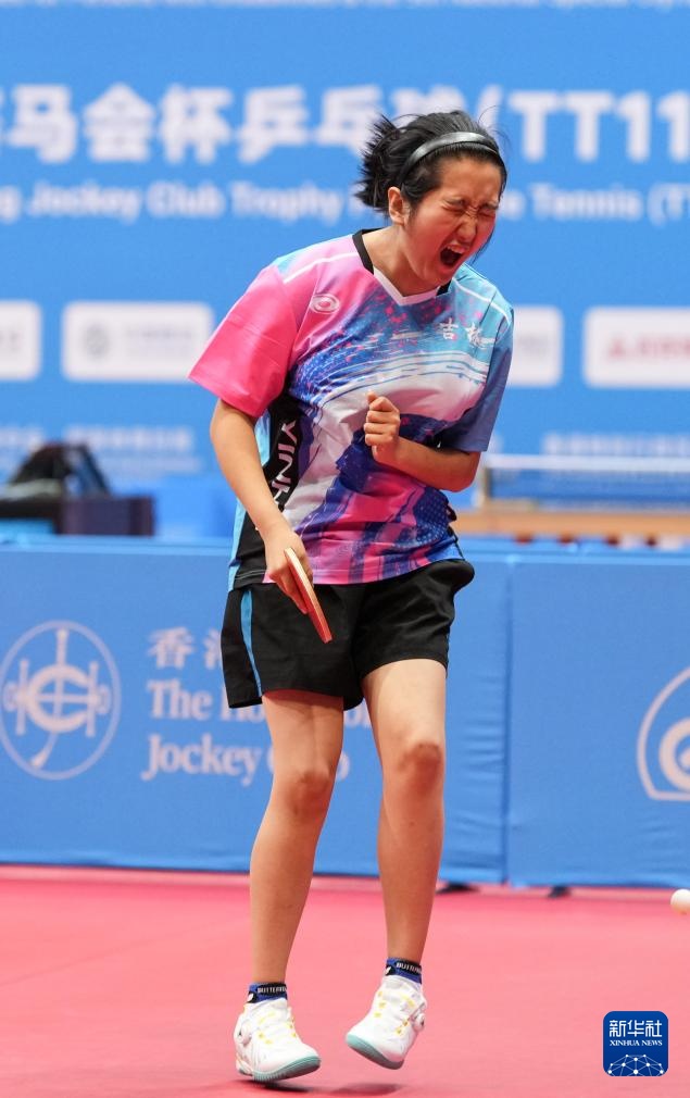 12月13日,吉林选手唐亦欣在TT11混合双打金牌赛中庆祝得分。最终,王博/唐亦欣3比0战胜香港一团选手温伟乐/黄珮淇,获得冠军。